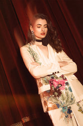over-sized blazers adorned with refined prints and ultra-feminine effects; fluid trousers that flatter the figure, featuring cargo-style pockets and pleats - design elements that define this season's standout pieces