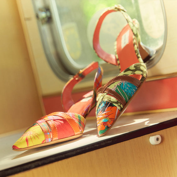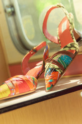 Peonia, a one-of-a-kind slingback: long toe, thin bands in vibrant colors, 5 cm heel inspired by modern architecture and, obviously, Mantero 1902's distinctive mix&match of prints