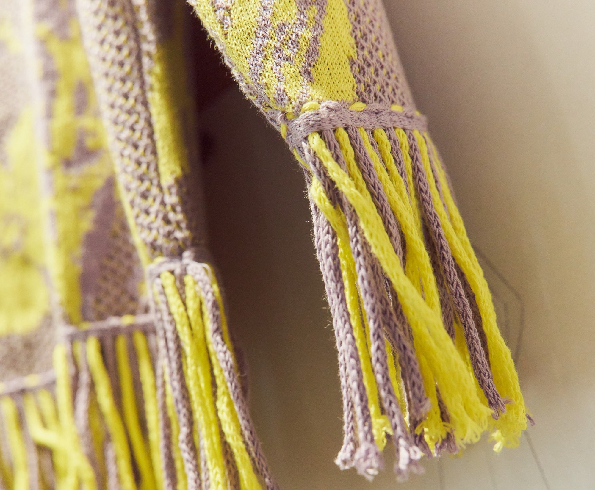 The jacquard effect takes the printed designs to a different dimension, made of intertwining threads and colours. All this on a slightly short sweater, adorned at the bottom with bicoloured fringes.
