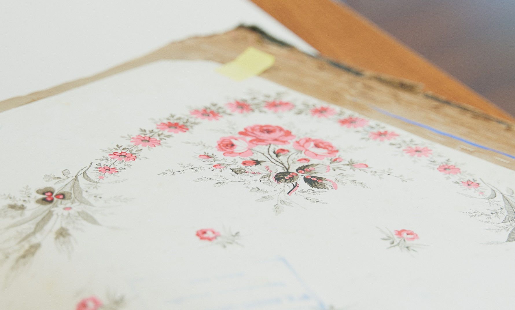 "Worry-free” inspires this floral arrangement. Light, delicate and romantic thoughts created by combining a 1960s Suzanne Kienz hand sketch and a late 19th century test paper from the Brunet-Lecomte archive.