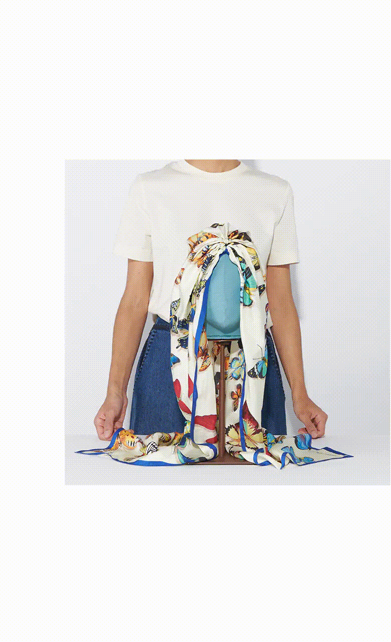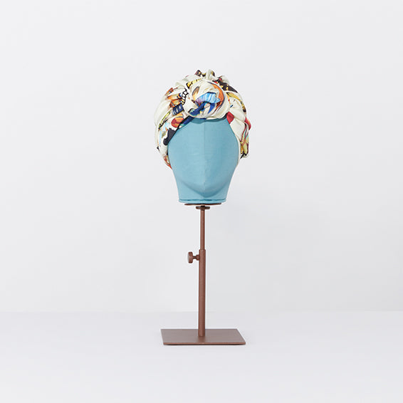 The turban is made from Mantero's core product, the 90x90 carré, and is cut in the middle creating two flounces and curled and tightened with a round elastic on one side. The result is a fabric that can be tightened and discretely or extravagantly knotted, according to one's style and mood.