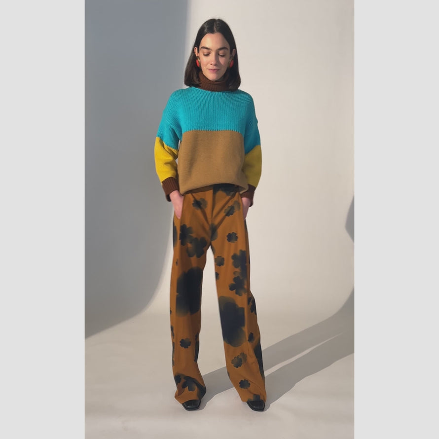 Maglione a collo alto in lana con lavorazione block color. Vestibilità morbida. Made in Italy. La modella è alta 177 cm e indossa la taglia S.